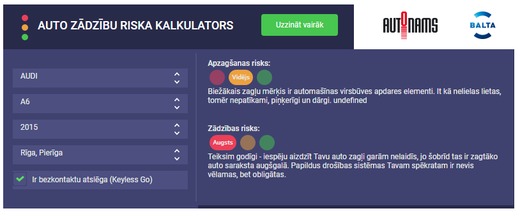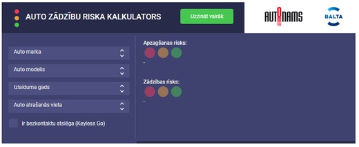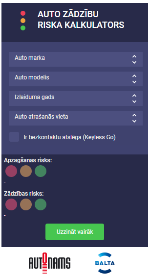Auto zādzību riska kalkulators veidots, balstoties uz aktuālajiem Valsts policijas datiem, kā arī apdrošināšanas sabiedrības BALTA un SIA “Autonams” ekspertu novērojumiem par automašīnu zādzību un apzagšanas tendencēm Latvijā. Vienlaikus BALTA un SIA “Autonams” eksperti norāda, ka auto īpašniekiem nevajadzētu pilnībā paļauties uz virtuālā kalkulatora rezultātiem par zemo auto zādzības risku.