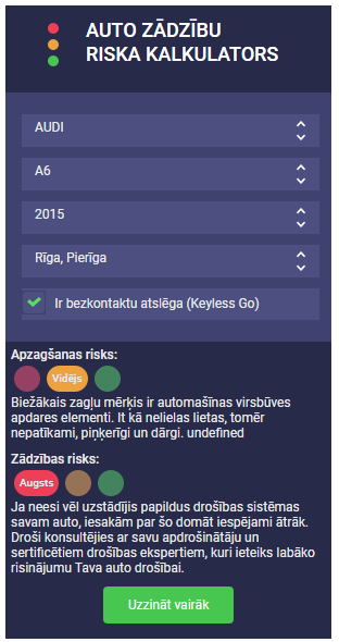 “Diemžēl zādzību tendences mainās daudz ātrāk nekā sabiedrības informētība par tām, tāpēc, lai brīdinātu un pievērstu automašīnu īpašnieku uzmanību aktuālajām tendencēm, radījām auto zādzību riska kalkulatoru,” komentējot izstrādāto virtuālo risinājumu, stāsta Kristaps Liecinieks, BALTA Transporta un risku parakstīšanas pārvaldes vadītājs.