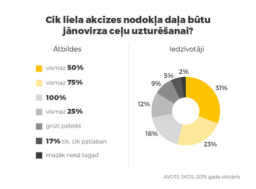 Atbildot uz jautājumu, kāda daļa no degvielas akcīzes nodokļa būtu jānovirza autoceļu tīkla uzturēšanai, 72 % no iedzīvotājiem pauda uzskatu, ka ceļu tīkla uzturēšanai būtu jānovirza vairāk nekā 50 % no iekasētā degvielas akcīzes nodokļa. 12 % respondentu norādīja, ka tiem jābūt vismaz 25 % no iekasētā, 31 % - ka vismaz 50 % no iekasētā, 23% - ka vismaz 75 % no iekasētā, bet 18 % respondentu uzskata, ka autoceļu uzturēšanai un remontdarbiem būtu jānovirza visi 100 % no šī iekasētā nodokļa. Tikai 6 % aptaujāto iedzīvotāju uzskata, šim nolūkam pietiek ar tik, cik patlaban jeb 17 %. 2 % no iedzīvotājiem norāda, ka ceļu uzturēšanai būtu jānovirza mazāk nekā patlaban, bet 0,4 % - ka ceļu remontdarbiem nevajadzētu novirzīt nekādu daļu no degvielas akcīzes nodokļa.