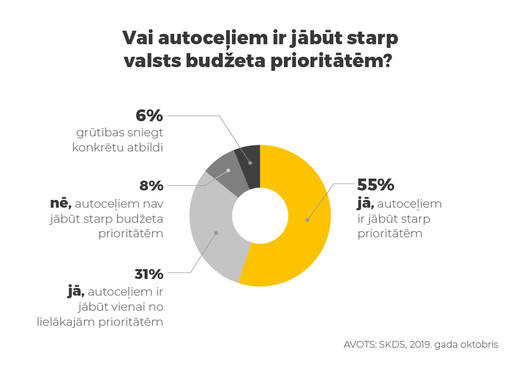 Vairāk nekā puse, jeb 55 % iedzīvotāju uzskata, ka autoceļiem ir jābūt starp prioritātēm, savukārt trešdaļa Latvijas iedzīvotāju, jeb 31 % ir pārliecināta, ka tai ir jābūt vienai no lielākajām valsts budžeta prioritātēm. Tikai 8% respondentu uzskata, ka autoceļiem nav jābūt starp budžeta prioritātēm, bet 6% respondentu bija grūtības sniegt konkrētu atbildi.