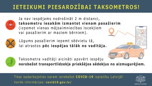Ārkārtējās situācijas laikā pasažieru komercpārvadājumos ar vieglo automobili vai vieglo taksometru, ja transportlīdzekļa konstrukcija nepieļauj iespēju tajā nodrošināt distancēšanos divu metru attālumā, transportlīdzekļa vadītājam tiek ieteikts pārvadāt tikai vienu pasažieri, kuram lūgums ieņemt sēdvietu tā, lai atrastos pēc iespējas tālāk no vadītāja.