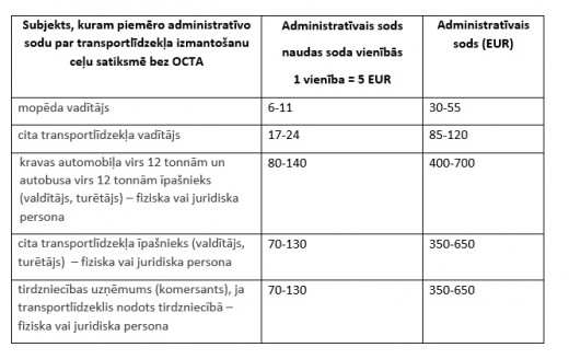 Izmaiņas normatīvajos aktos paredz arī citādu naudas sodu piemērošanas kārtību. Turpmāk administratīvais sods par transportlīdzekļa izmantošanu ceļu satiksmē bez OCTA tiks aprēķināts naudas soda vienībās, nosakot, ka 1 vienība ir līdzvērtīga 5 EUR.