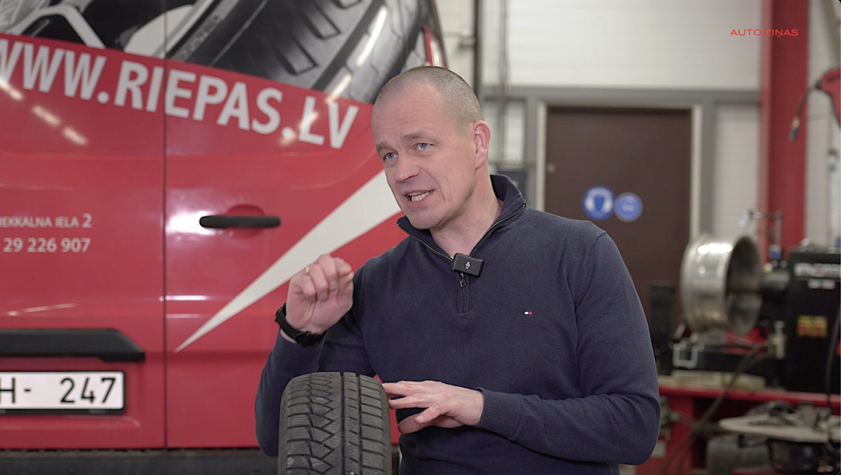 Riepu protektora dziļumu vēlams pārbaudīt reizi divos mēnešos. Izmantojot īpašas atzīmes uz riepām, nodiluma kritisko robežu var noteikti bez jebkādiem mērinstrumentiem. Tikai jāzina, kur skatīties. “Viena atzīme norāda uz 1,6 mm, otra uz 4 mm. Pretim tai jāmēģina atrast riepas malā sniegpārsliņa vai tml. simbols. Un tur uz protektora daļas tad meklēt īsto atzīmi. Ja atzīme ir zemāk par pārējo protektoru, ir OK, ja vienā līmenī - nav OK.”