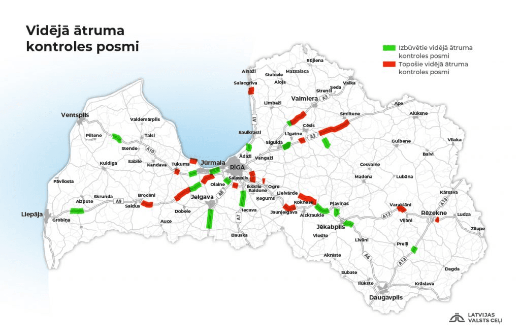 Tostarp vidējā braukšanas ātruma kontrole tiks ieviesta uz Vidzemes šosejas (A2) posmā no Krasta ielas Ieriķos līdz autoceļam P20 jeb pagriezienam uz Cēsīm un no Bērzkroga līdz Smiltenes aplim, kā arī uz Valmieras šosejas (A3) posmā no Stalbes līdz Rubenei un uz Daugavpils šosejas (A6) posmā no Dzelmēm līdz Uplejām.