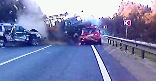 Iespaidīga trīs spēkratu sadursme, ko izraisa apvidus automobilis, kas, neskatoties uz nepārtraukto līniju, izdara apdzīšanu bīstamā, nepārredzamā līkumā.