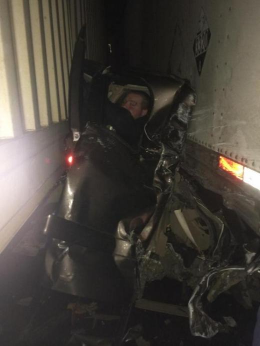 Šī fotogrāfija apceļojusi visu pasauli - izskatās briesmīgi, taču varat neuztraukties - starp diviem smagsvariem saspiestais Chevrolet pikapa vadītājs Kalebs Vitbijs avārijā izdzīvo praktiski bez traumām.