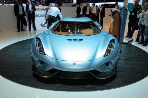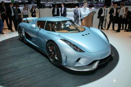 Zviedrijas supermašīnu ražotājs "Koenigsegg" Ženēvas autoizstādes apmeklētājiem izrāda hibrīda varenauto "Regera," kas komplektēts ar 1500 ZS jaudīgu spēka iekārtu.
