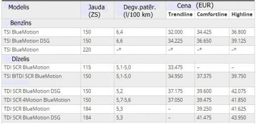 32 000 eiro (visas cenas – Vācijas tirgum) tiks prasīti par versiju ar 150 ZS benzīna motoru Trendline komplektācijā, savukārt visdārgākais būs TDI SCR BlueMotion DSG variants ar 184 ZS jaudīgu dīzeļdzinēju Highline komplektācijā, kas no pircēja maciņa izvilinās gandrīz 44 000 eiro. Ja topošo īpašnieku apmierina mazāk jaudīgs dīzeļdzinējs (115 ZS) un pieticīgāka komplektācija, var iztikt ar 33 345 eiro.