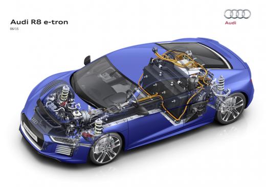 "Audi R8 e-tron" bateriju komplekta 7488 šūnas apvienotas 52 moduļos, paslēptas vidustunelī un aiz aizmugures sēdekļa. 595 kg smagais komplekts integrēts automobiļa konstrukcijā un kalpo kā struktūru pastiprinošs elements.