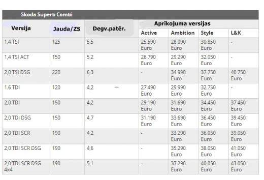 "Škoda Superb Combi" cena startē no atzīmes 25 590 eiro par bāzes versiju ar 1,4 litru 125 ZS benzīna motoru, lētākais dīzelis (120 ZS) maksās 27 490 eiro, bet visdārgākā universāla modifikācija ir 43 050 eiro vērtā 2,0 TDI SCR DSG 4x4 – pilnpiedziņas variants ar 2,0 litru 190 ZS dīzeļdzinēju un DSG divsajūgu automātisko pārnesumkārbu visbagātākajā aprīkojuma versijā L&K.