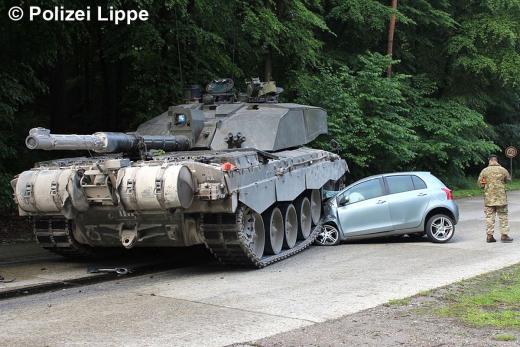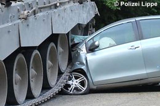 Līdzīgs negadījums Vācijā notika vasaras sākumā, kad 18 gadus veca autovadītāja ar °Toyota Yaris,° izbraucot uz ielas, kas atvēlēta militāristiem, nepamanīja tanku kolonnu (apakšējie attēli).