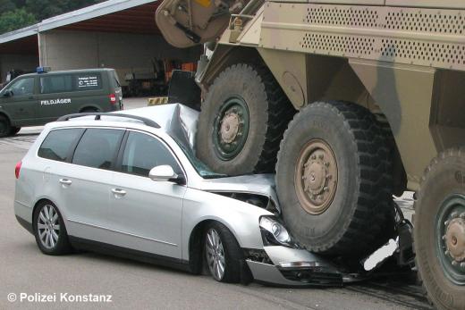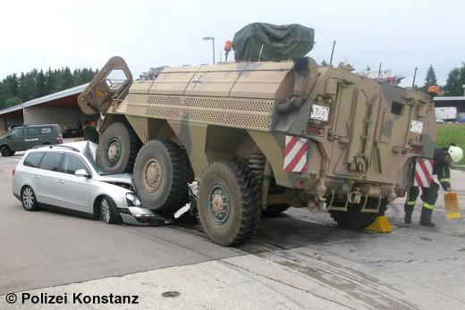 Vācu Autobild, atsaucoties uz policijas informāciju raksta, ka bruņu transportiera vadītājs, veicot izmēģinājuma braucienu nav pamanījis vieglo automobili "Volkswagen Passat" un ar diviem kreisās puses riteņiem uzbraucis uz tā korpusa. Trieciens ir bijis tik spēcīgs, ka vieglais auto vairākus metrus stumts atpakaļgaitā. Militārā tehnika pēdējā brīdī tomēr apstādināta, tādēļ "Passat" vadītājs ticis cauri ar viegliem ievainojumiem, ko nevar teikt par aptuveni 12 000 eiro vērto automašīnu, kas ekspertuprāt, ir jānoraksta.