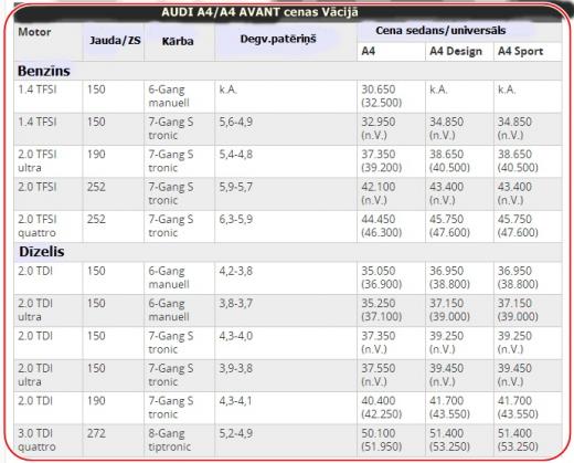 Vācijas autobūves kompānija Audi uzsākusi pieteikumu pieņemšanu no klientiem, kas vēlas iegādāties jaunās paaudzes A4 sedanu vai A4 Avant universālu. Sedana cena Vācijā sākas no EUR 30 650, universāls ir par EUR 1850 dārgāks.