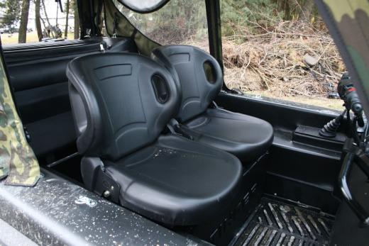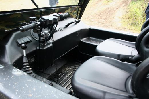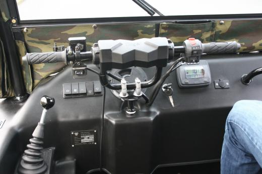 Transportlīdzekļa vadība notiek ar motociklam līdzīgu stūri, bet uz paneļa novietotā svira ļauj izvēlēties CVT kārbas pārnesumus uz priekšu un atpakaļ, kā arī ieslēgt pazeminātos pārnesumus. Arī gāzi piedot ar pagriežamo motocikla stūres rokturi labajā pusē, bet virziena maiņa notiek, pagriežot stūri pa labi vai pa kreisi. Ja nepieciešams straujāks pagrieziens, kopā ar stūri jāpielieto kreisajā pusē novietotā bremze, kas nobloķēs kāpurķēdi attiecīgajā pusē.