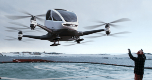 eHang 184 ir aptuveni 180 kg smags bezpilota liadaparāts ar astoņiem propelleriem, kas pilnībā automātiskā režīmā spēj pārvietot vienu cilvēku un viņa bagāžu no punkta A līdz punktam B. Arī par dronekopteru jeb lidojošo taksometru dēvētais lidaparāts var pacelties 3000 m augstumā un lidot ar ātrumu 100 km/h, taču – vien 23 minūtes. Drona kabīne aprīkota ar vienvietīgu sēdekli, kondicionieri, 4G modemu un lielu skārienjutīgu ekrānu, kurā jāievada lidojuma galapunkts. Pārējo EHang 184 izdarīs pats, ieskaitot avārijas nosēšanos gadījumā, ja tas novirzīsies no kursa.