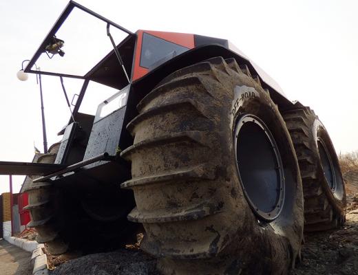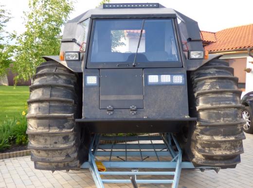 Garagašjana amfībijas konstrukcijā galvenais uzsvars likts uz riteņiem – milzīgām, zema spiediena riepām, kas nodrošina kustību uz priekšu un komplektā ar hermētisko alumīnija virsbūves pamatu, ļauj tam arī peldēt. Riepas vienlaicīgi kalpo arī kā piekare – tās savienotas ar mainīga diametra gaisa kanāliem, kurus iespējams pat pilnībā noslēgt. Kad mašīna uzbrauc šķērslim ar vienu riepu, spiediens vienmērīgi sadalās pa citiem riteņiem, ļaujot tiem deformēties spēcīgāk. Par amfībijas dzinējspēku kalpo japāņu Kubota 1,5 litru četru cilindru dīzeļdzinējs ar 44 ZS jaudu un piecu pakāpju manuālā pārnesumkārba ar "Sachs" sajūgu. Pie konstrukcijas īpatnībām pieder pagriešanās mehānisms pēc kāpurķēžu traktora principa – ar sviru palīdzība. Pavelkot vienu vai otru sviru, visurgājējs griežas pa labi vai kreisi, pavelkot abas – bremzē, un tāpat kā kāpurķēžu traktors, var apgriezties uz vietas. Savukārt degvielas sistēma konstruēta tā, ka motors to saņems arī tad, ja transportlīdzeklis ilgstoši atradīsies kritiskos sasveres leņķos.