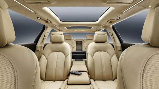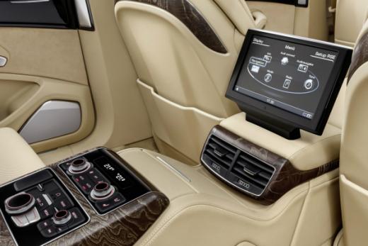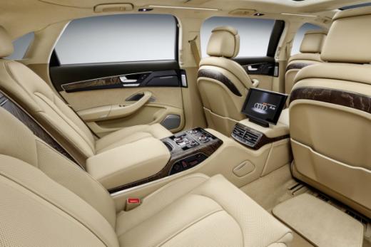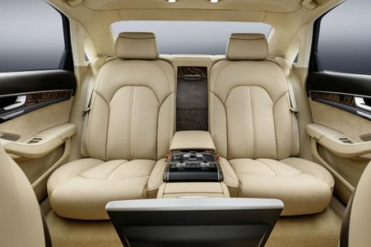 Modelī Audi A8 L extended visi pasažieri sēž braukšanas virzienā. Visi seši sēdekļi ir apdarīti ar īpaši mīksto Valcona ādu Velvet Beige krāsā. Otrās un trešās rindas sēdekļi ir katrs atsevišķi elektriski regulējami. Trešajā sēdekļu rindā ir vienlaidu viduskonsole, aizmugurējo sēdekļu izklaides sistēmas ekrāns un aukstumkaste.