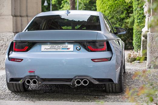"2002 Hommage" tapis par godu pirmajam „02”, kas pirms 50 gadiem aizsāka bavāriešu sērijveida turbo modeļu ēru. Koncepts izgatavots uz "M2" bāzes un izceļas ar platām riteņu arkām un spārniem, masīvu priekšējo bamperi, kam izveidoti vertikāli gaisa ventilācijas kanāli abos sānos un liela „elpošanas” atvere apakšējā malā. Automašīnai ir matēts motora pārsegs, jumts un bagāžnieka vāks, bet virsbūves apakšējā daļa krāsota spīdīgā "Space Race Metal" tonī.Spēcīgi veidotos sānus pasvītro oglekļa šķiedras dekors šauras horizontālas līnijas veidā.