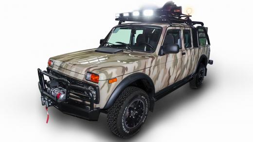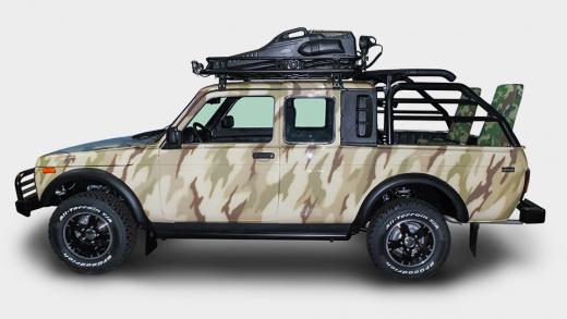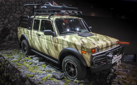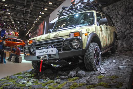Maskavas autoizstādes apmeklētāji starp nedaudzajiem jaunumiem var apskatīt unikālu Lada 4x4 pikapu, kas pielāgots mednieku vajadzībām.