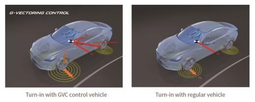 GVC uzlabo riepu veiktspēju, koncentrējoties uz riepu vertikālo slodzi. Brīdī, kad autovadītājs sāk griezt stūri, GVC kontrolē dzinēja griezes momentu, lai radītu palēninājuma smaguma spēku, tādējādi pārnesot