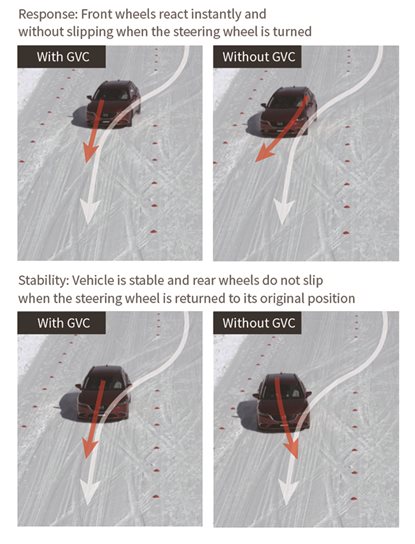 Līdz šim sānu un gareniskā paātrinājuma smaguma spēki tika kontrolēti atsevišķi. GVC ir pirmā sistēma pasaulē, kas pielāgo dzinēja griezes momentu stūres darbībai, lai kontrolētu šos abus spēkus vienlaikus un optimizētu katras riepas vertikālo slodzi. Automobilis, reaģējot uz autovadītāja darbībām, kustās daudz precīzāk, samazinot vajadzību veikt stūrēšanas korekcijas, kuras nereti tiek veiktas neapzināti. Autovadītājs izjūt lielāku vienotību ar automobili un brauc daudz pārliecinošāk, jo automobilis precīzi ievēro viņa izvēlēto braukšanas trajektoriju. Ir samazinājies kopējais nogurums garos pārbraucienos, savukārt plūstošā pāreja starp smaguma spēkiem samazina pasažieru līgošanos pagriezienu laikā, uzlabojot braukšanas izjūtu un pasažieru komfortu. GVC arī uzlabo vadāmību un stabilitāti uz slapjiem vai apsnigušiem ceļiem, un uzlabotā saķere vairo autovadītāju sirdsmieru.*