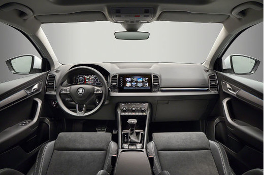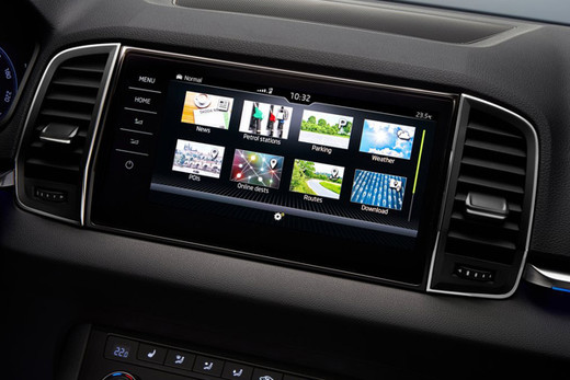 Karoq topversija iegūs multimediju kompleksu Columbus ar žestu vadību, Apple CarPlay, Android Auto un Mirror Link, WLAN-Hotspot, Online atbalsta servisu un speciālu pogu, kas ļaus izsaukt palīdzības dienestu.