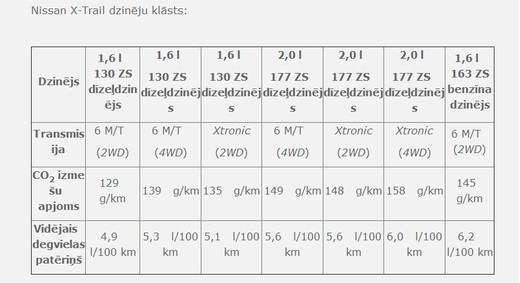 Jaunais Nissan X-Trail saglabā savu trīs efektīvo dzinēju klāstu, ieskaitot 2,0 litru 177 ZS dīzeļdzinēju, kas tika laists klajā pērn. Klienti var izvēlēties savām vajadzībām vispiemērotāko X-Trail versiju – ar benzīna dzinēju vai kādu no divām dīzeļdzinēja versijām, 6 pārnesumu manuālo vai Xtronic automātisko pārnesumkārbu, 2WD vai 4WD piedziņu un 5 vai 7 sēdvietu versiju.