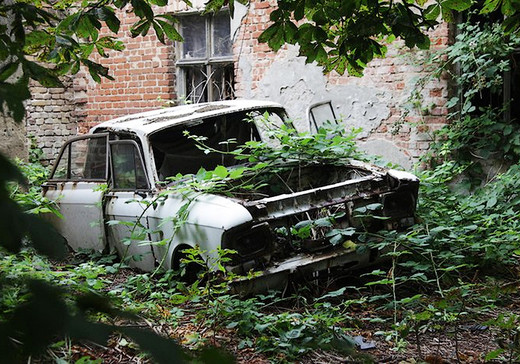 Berlīnes rajonā Pankovā uzieta pamesta auto darbnīca ar “Moskvič” un “Trabant” automobiļiem.