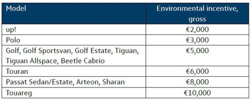 Piemēram, klientam, kas izvēlēsies iegādāties VW Up, koncerns piemēros atlaidi 2000 eiro apmērā, Polo novērtēts ar 3000 eiro, Golf, Golf Sportvan, Golf Variant, Tiguan Allspace un Beetle Cabrio – 5000 eiro, VW Touran, Passat, Sharan, Arteon – 8000 eiro, Touareg – 10 000 eiro.