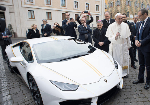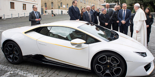 Itālijas sporta automašīnu ražotājs "Lamborghini" uzdāvinājis Romas pāvestam 610 Zs jaudīgās "Huracan" īpašo versiju. 325 km/h ātrais spēkrats gan nepaliks pie Franciska I, bet tiks pārdots "Sotheby`s" izsolē.