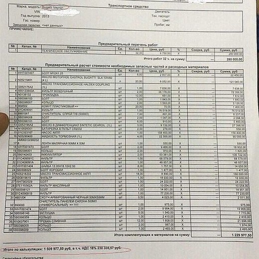 Krievu blogeris publicējis kāda Bugatti Veyron klienta servisā veikto darbu sarakstu, norādot cenas rubļos, kas uzskatāmības labad pārvērstas dolāros. Autors izvilcis interesantākos punktus, uzsverot, ka pat niecīgākā Bugatti detaļa maksā kā smalks izstrādājums no juvelieru veikala.