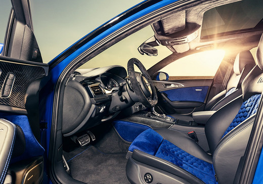 Zilās krāsas akcenti redzami arī interjera apdari ar melnajiem alkantara griestiem, "Valcona" ādas sēdekļiem un grīdas paklājiņiem. Sliekšņus grezno "RS 6" logotips, plāksnītes ar versijas nosaukumu un eksemplāra kārtas numuru (1/150).