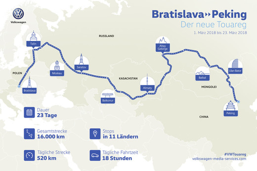 Ražotājs atklājis, ka daļēji maskētais Touareg (līmplēve nosedza priekšpusi un aizmuguri) devās ceļā no apvidus auto ražotnes Bratislavā un pēc 21 dienas finišēja Pekinā. Vienas diennakts laikā komanda nobrauca aptuveni 1000 km, kopumā veicot 16 500 km caur Slovākiju, Austriju, Čehiju, Poliju, Lietuvu, Latviju, Igauniju, Krieviju, Kazahstānu, Mongoliju un Ķīnu, pārvarot dažādas kvalitātes un seguma ceļus un piedzīvojot temperatūras svārstības no mīnus 23 līdz plus 21 grādam.
