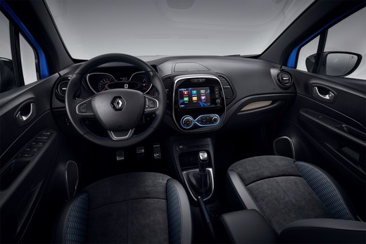 Captur S-Edition šikajā, sportiskajā salona apdarē izmantots ekskluzīvi alkantaras un ādas imitācijas materiāli ar zilām dekoratīvām nošuvēm, kas veido saspēli ar roku balstiem, ātrumu pārslēgšanas sviru un stāvbremzes sviru.