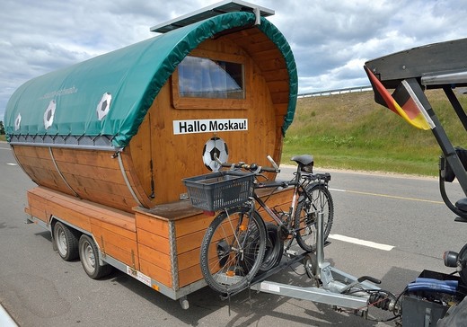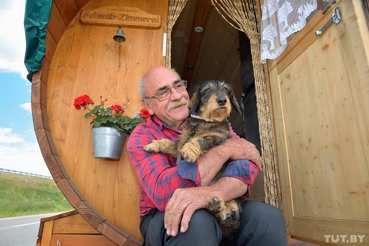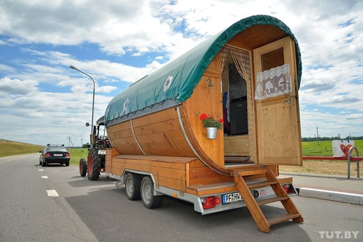 Traktors aiz sevis velk piekabi vīna mucas izskatā, kas savulaik kalpojusi kā pārvietojamā sauna. Tagad tā pārbūvēta par māju uz riteņiem ar guļamtelpu, galdiņu un virtuvi.