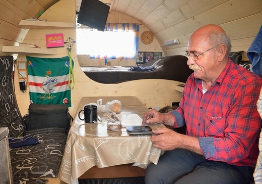 Ieeju namiņā pensionārs izgreznojis ar uzrakstu “Šeit esmu kā mājās” un paziņojis, ka viņam nekur īpaši nav jāsteidzas.
