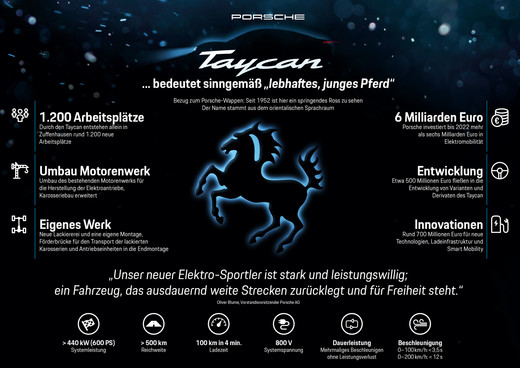 Mobilitātes nākotne ir vēl soli tuvāk: pirmā pilnīgi elektriskā Porsche sērijveida ražošanu ir paredzēts uzsākt nākamajā gadā. Tagad sagatavošanās procesā automobilim ir dots oficiāls nosaukums: konceptauto „Mission E" — nosaukums, ar ko pašlaik apzīmē Porsche pilnīgi elektrisko piedāvājumu, — turpmāk sauksies Taycan.