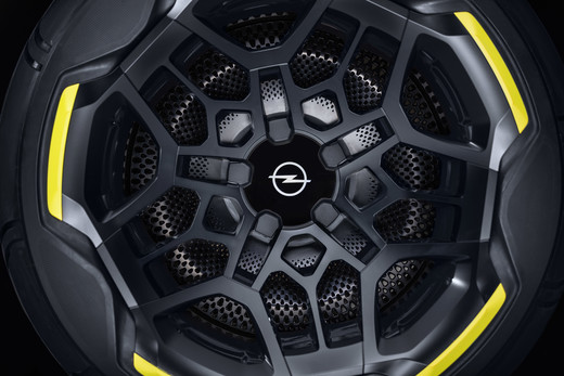 Lai līdzsvarotu šo vizuālo detoksikāciju, dažas grafiskas detaļas GT X Experimental izskatu padara aizraujošāku. Zem loga līnijas uz vadītāja puses sānu aizmugurējām durvīm ir iegravēti apcirsti trīsstūri: vienā no tiem iestrādāts neliels, sešstūrains LED ekrāns, kas rāda akumulatora uzlādes līmeni. 17 collu riteņi izskatās daudz lielāki, pateicoties robustiem gumijas pārsegumiem, kas turpinās arī uz diska, lai vizuāli palielinātu tumši zilo riepu izmēru. Dzeltenās grafiskās līnijas uz diska sasaucas ar virsbūves dzelteno akcentu un ieskauj elektronisko Opel zibens emblēmu, kas, neatkarīgi no riteņa griešanās, vienmēr ir stacionāra. Un, lai uzsvērtu automašīnas SUV raksturu, aizsargājoša apšuvuma apdare ap apakšējo virsbūves daļu pastiprina GT X Experimental pamatīgo, stingro stāju un izturīgo izskatu.