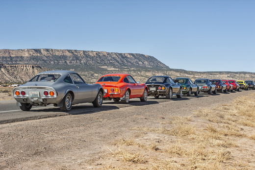 Vairāk nekā divi duči Opel GT fanu bija ieradušies ASV, lai atzīmētu modeļa 50. gadskārtu un kopīgi izbrauktu daļu Route 66.