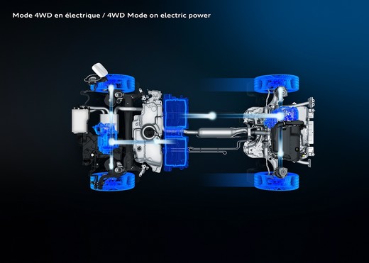 Neatkarīgi no dzinēju versijas zem aizmugures sēdekļiem ir novietots augstsprieguma litija akumulators ar kapacitāti 11,8 KWh HYBRID dzinējam un 13,2 KWh – HYBRID4 dzinējam. Saskaņā ar WLTP testa metodes rezultātiem ar akumulatoru var nobraukt līdz 50 kilometriem (60 kilometri saskaņā ar NEDC testa metodes rezultātiem). Lai dzinējs darbotos iespējami klusāk, noklusējot iestatīts nulles emisijas elektromotora režīms, ja to atļauj akumulatora uzlādēšanas līmenis. Pirms darbu pārņem benzīna dzinējs, ar elektromotoru var attīstīt ātrumu līdz 135 km/h.
