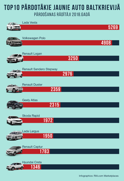 Interesanti, ka ievērojamas atšķirības jaunu auto tirgū vērojamas Baltijai tuvējās valstīs – Baltkrievijā un Ukrainā. Proti, Baltkrievijā lielāko jauno auto tirgus daļu aizņem Krievijā ražotas automašīnas, īpaši - zīmols Lada. Baltkrievijā pērn pārdotāko jauno auto TOP 10: Lada Vesta – 5269, Volkswagen Polo – 4908, Renault Logan – 3250, Renault Sandero Stepway – 2976, Renault Duster – 2359, Geely Atlas – 2315, Skoda Rapid – 1972, Lada Largus – 1950, Renault Captur – 1783, Hyundai Creta – 1346.