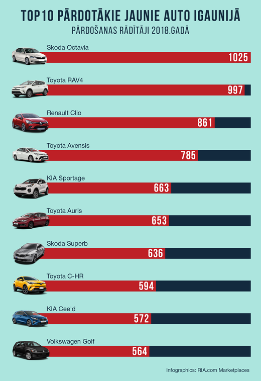 Pārdotāko jauno auto TOP 10 Igaunijā: Škoda Octavia – 1025, Toyota RAV4 – 997, Renault Clio – 861, Toyota Avensis -785, KIA Sportage – 663, Toyota Auris – 653, Škoda Superb – 636, Toyota C-HR -594, KIA Cee'd – 572, Volkswagen Golf – 564.
