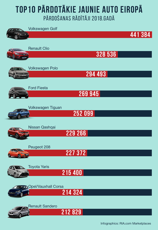 Savukārt Eiropas tirgū kopumā pēdējos gados dominē Volkswagen un Renault. Kompakts, ar zemu degvielas patēriņa līmeni, ar labu nobraukumu un komfortu - tieši tos kā prioritārus izvēles faktorus min Eiropas Savienības valstu iedzīvotāji, iegādājoties gan jaunus, gan lietotus auto. TOP 10 2018.gadā pārdotāko jauno automašīnu saraksts ir šāds: Volkswagen Golf - 441 384, Renault Clio - 328 536, Volkswagen Polo - 294 493, Ford Fiesta - 269 945, Volkswagen Tiguan - 252,099, Nissan Qashqai - 229 266, Peugeot 208 - 227 372, Toyota Yaris – 215 400, Opel / Vauxhall Corsa - 214 324, Renault Sandero - 212 829.