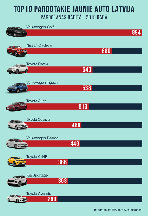 Kopumā Latvijā jaunu auto pārdošanas rādītāji ik gadu palielinās, taču izteikta līdera Latvijas tirgū šobrīd nav. Pērn pārdotākais auto modelis Latvijā bija Volkswagen Golf, kuram seko Nissan Qashqai un Toyota RAV-4, liecina “RIA.com Marketplaces” apkopotā informācija. Desmit pārdotākie jauno auto modeļi Latvijā 2018.gadā bija: Volkswagen Golf – 894 pārdoti auto, Nissan Qashqai – 680, Toyota RAV-4 – 540, Volkswagen Tiguan – 538, Toyota Auris – 513, Škoda Octavia – 460, Volkswagen Passat – 449, Toyota C-HR – 366, Kia Sportage – 363 un Toyota Avensis – 290.