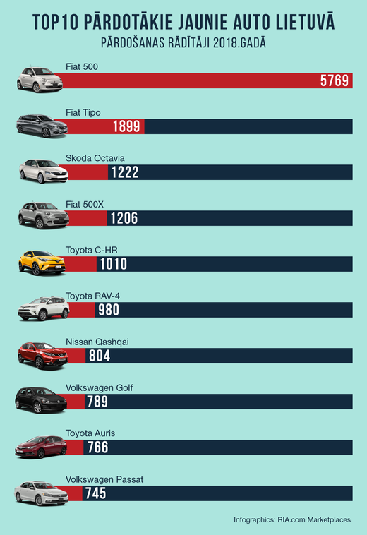 Pirmā vieta jaunu automobiļu pārdošanas topā Lietuvā pagājušajā gadā pieder Fiat 500 – pērn kaimiņvalstī pārdotas 5769 šī modeļa automašīnas, tuvāko konkurentu, kas arī ir Fiat, apsteidzot vairāk nekā trīs reizes. Otrs populārākais modelis lietuviešiem pērn bija Fiat Tipo ar 1899 vienībām, bet trešo vietu ieņem Škoda Octavia (1222 pārdoti auto). Pārdotāko jauno auto TOP 10 Lietuvā: Fiat 500 – 5769, Fiat Tipo – 1899, Škoda Octavia – 1222, Fiat 500X – 1206, Toyota C-HR – 1010, Toyota RAV-4 – 980, Nissan Qashqai – 804, Volkswagen Golf – 789, Toyota Auris – 766, Volkswagen Passat – 745.
