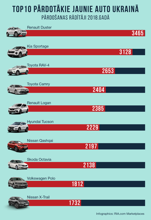 Auto pircēji Ukrainā priekšroku dod tādiem pazīstamiem zīmoliem kā Renault, Kia un Toyota. Ukraiņi pārsvarā izvēlas crossover modeļus ar augstu klīrensu un auto ar mazu degvielas patēriņu. Pirktāko jauno auto TOP 10 Ukrainā 2018.gadā ir: Renault Duster – 3465, Kia Sportage – 3128, Toyota RAV-4 – 2653, Toyota Camry – 2404, Renault Logan – 2385, Hyundai Tuscon – 2229, Nissan Qashqai – 2197, Skoda Octavia – 2138, Volkswagen Polo – 1812, Nissan X-Trail – 1732.