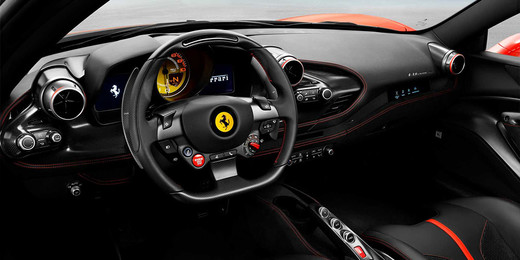 Jaunā varenauto salons saglabājis līdzšinējo koncepciju, taču katrs priekšējā paneļa, durvju un centrālā tuneļa elements ir projektēts un izstrādāts no jauna. F8 Tributo ir jauna stūre, multimediju sistēma ar septiņu collu ekrānu, bet par papildmaksu pieejama pakete, kas palīdzēs samazināt automobiļa svaru.