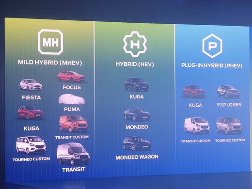 Hibrīda modifikācijas ar iespēju 50 km veikt pilnībā elektriskā režīmā iegūs krosovers Kuga un septiņvietīgā apvidus auto Explorer Eiropas versija. Tikpat daudz ar elektrību spēs nobraukt arī astoņvietīgais minivens Tourneo Custom Plug-In Hybrid. Kompaktais krosovers Kuga būs apgādāts ar Mild Hybrid tehnoloģiju, bet 2020.gadā gaidāmais krosovers Mustang stilā būs pilnībā elektrisks un spēs nobraukt līdz pat 600 km.