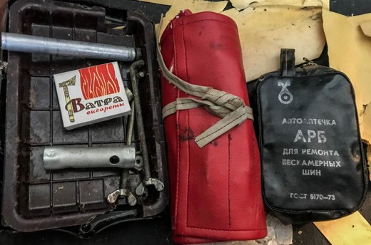 Volgas bagāžniekā atrastas četras kastes ar 80.gados ražotu degvīnu Russkaja Vodka, bet cimdu nodalījumā – zviedru grupas Katz kasete, ko rūpnīca iekļāva komplektā, lai īpašnieks varētu pārbaudīt audio sistēmas darbību. Mašīnā bijusi arī servisa grāmatiņa ar atzīmi par automobiļa iegādi, magnetolas instrukcija, nelietots rezerves ritenis un rūpnīcas instrumentu komplekts. Kā raksta blogeris, uzreiz pēc pirkuma īpašnieks veicis pretrūsas apstrādi ar tolaik populāro līdzekli Buvanol, bet Vatra cigarešu paciņas salonā ievietotas, mēģinot pasargāt sēdekļus no kodēm.