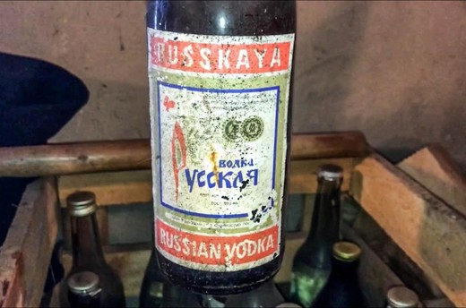 Kādā garāžā Krievijā uzieta “laika kapsula” no padomju laikiem – pirms 30 gadiem ražots automobilis Volga un četras kastes spirtotā dzēriena Russkaja Vodka.